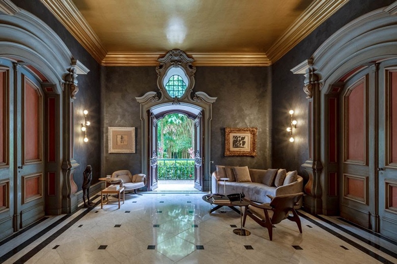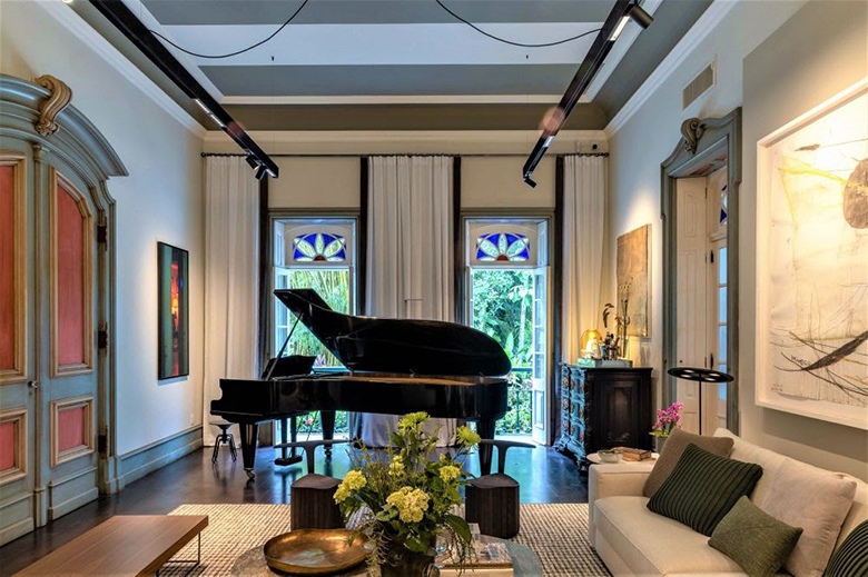 Cinzas e neutros. Um capítulo à parte nessa casa são as portas. São 48 na casa principal, que se abrem para os jardins e para fazer a ligação entre os amplos salões internos. Quase sempre em tons de cinza e rosa, elas inspiraram o elenco de diferentes formas. No Hall de Entrada, Rodrigo Jorge resolveu criar uma ambientação bem clássica em homenagem à história da casa, o que fica claro na escolha das cores do espaço: grafite, quase preto, nas paredes; e dourado, no teto. Já Luiz Fernando Grabowsky optou por tons mais neutros em sua Sala do Piano. Nas paredes, o branco. No teto, listras cinzas e brancas. E, no salão, uma mistura de móveis de design nacional dos séculos XIX, XX e XXI.