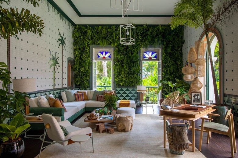 Verdes. Mas nenhum tom aparece tanto como o verde. Os 12 mil metros quadrados de jardins com espécies da Mata Atlântica foram, sem dúvida, uma grande inspiração para os profissionais que levaram a cor para dentro dos ambientes. Seja com plantas, seja no mobiliário e nas paredes, o verde está por todos os lados. Destaque para o Jardim de Inverno, de Jean de Just, que traz literalmente o jardim para dentro da casa; e para a Sala de Banho Deca, de Beto Figueiredo e Luiz Eduardo Almeida, que usaram um tom bem escuro para ressaltar ainda mais a banheira de mármore original do espaço, que, dizem, teria pertencido à Imperatriz Teresa Cristina.