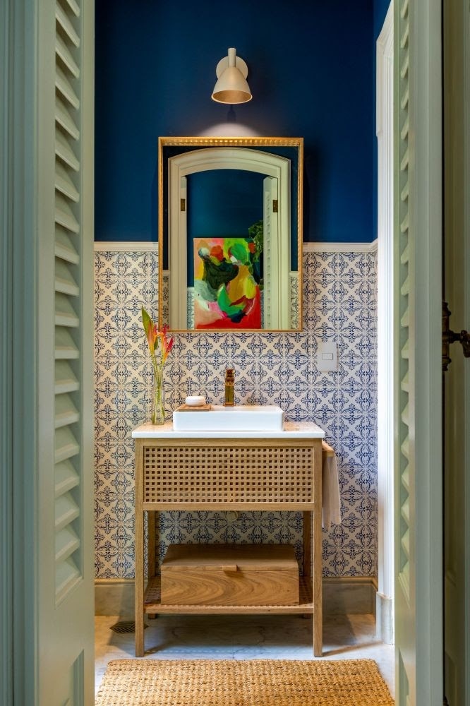 Azuis. As pinhas de cerâmica que estão por toda a parte nos jardins e varandas da casa inspiraram as arquitetas Lucilla Pessoa de Queiroz e Renata Caiafa Quintanilha, que apostaram no azul em seu Café. O tom aparece em todo o divertido mobiliário desenhado pela dupla exclusivamente para o ambiente e, também, nas cerâmicas usadas por Denise Stewart em uma instalação no interior do espaço. E há azul também no Lavabo, do Estúdio Manu+Ca, que usou o mesmo tom dos azulejos originais para pintar meia parede do espaço, trazendo contemporaneidade ao ambiente.