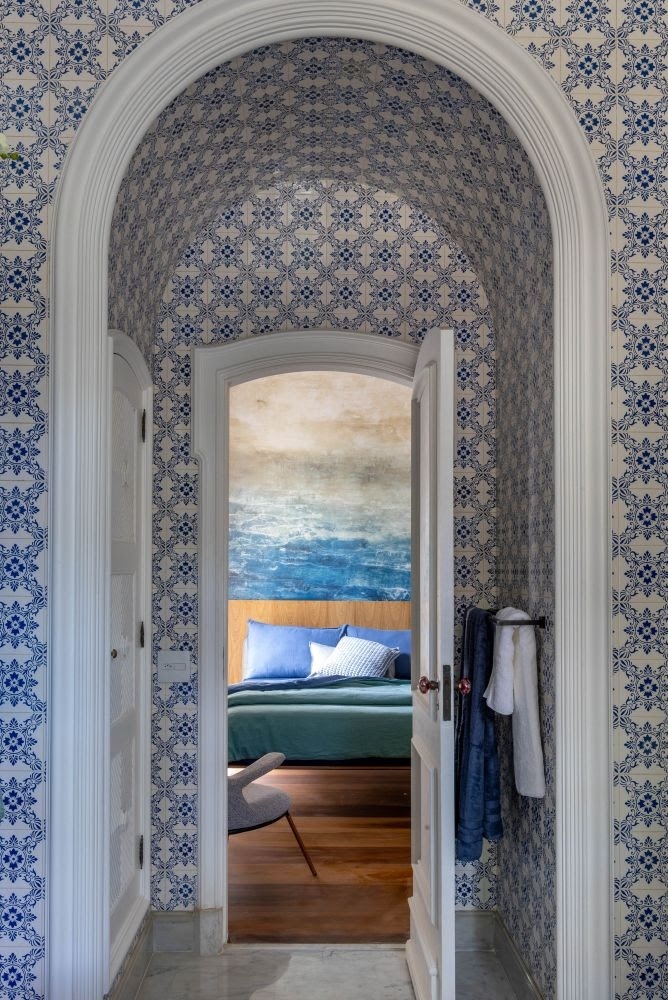 Brancos. Sim, habemus branco. A cor foi opção da dupla Ângela Leite Barbosa e Daniel Marques Mendes para os portais de sua Suíte do Hóspede e deu um destaque ainda mais especial à já belíssima azulejaria original do banheiro. Paola Ribeiro também apostou no tom em seu Quarto de Casal. Ele está em parte do mobiliário, nos tecidos da roupa de cama e das cortinas e especialmente nos elementos originais da arquitetura da casa como portais, portas e estantes. Mas, em nenhum ambiente, ele tem tanta importância como na Pequena Sala de Estudos, de Lia, Felipe e Betina Siqueira. Ali, o tom funciona tanto como rebatedor da luz natural que entra pelas janelas do espaço, quanto para trazer frescor, sossego e simplicidade ao ambiente, de pé-direito altíssimo e imponente.