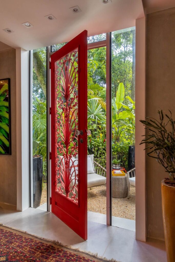 Vermelhos. A cor, que aparece nos vitrais da casa, também poderá ser vista pelos ambientes. Um exemplo é a porta em ferro, cheia de detalhes inspirados na arquitetura do palacete, criada pela arquiteta Vivian Reimers para sua Livraria. O espaço, construído em meio ao jardim, se abre para o verde criando uma ambientação que promete encantar os amantes da leitura. Mas também há pontos de vermelho nos bancos criados por Ivan Rezende no seu Pátio da Escultura; em uma das obras de arte selecionadas por Mario Costa Santos, para a sua Sala de Arte “Contemplação”; e no neon usado por Caco Borges e Carolina Haubrich, no Home Office & Games.