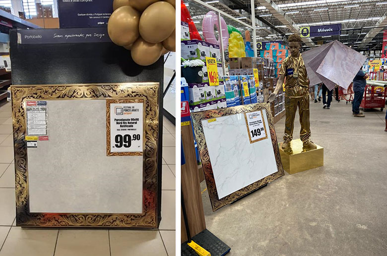 As lojas Potiguar de São Luís e Imperatriz estão promovendo de forma diferenciada as opções de porcelanato, apresentando os mesmos com o status de “obras de arte” e contando com intervenções artísticas como as Estátuas Vivas na lojas (Fotos/Divulgação)