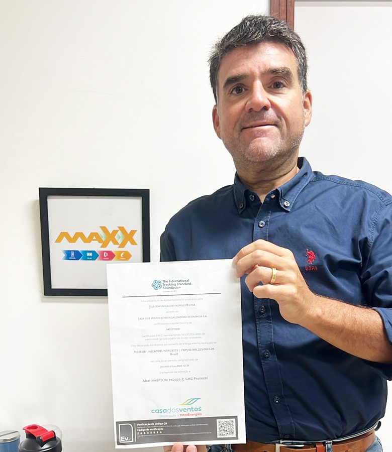 O CEO da Maxx, Augusto Diniz, exibe o certificado que atesta a compensação com energia limpa na operação da operadora (Foto/Divulgação)